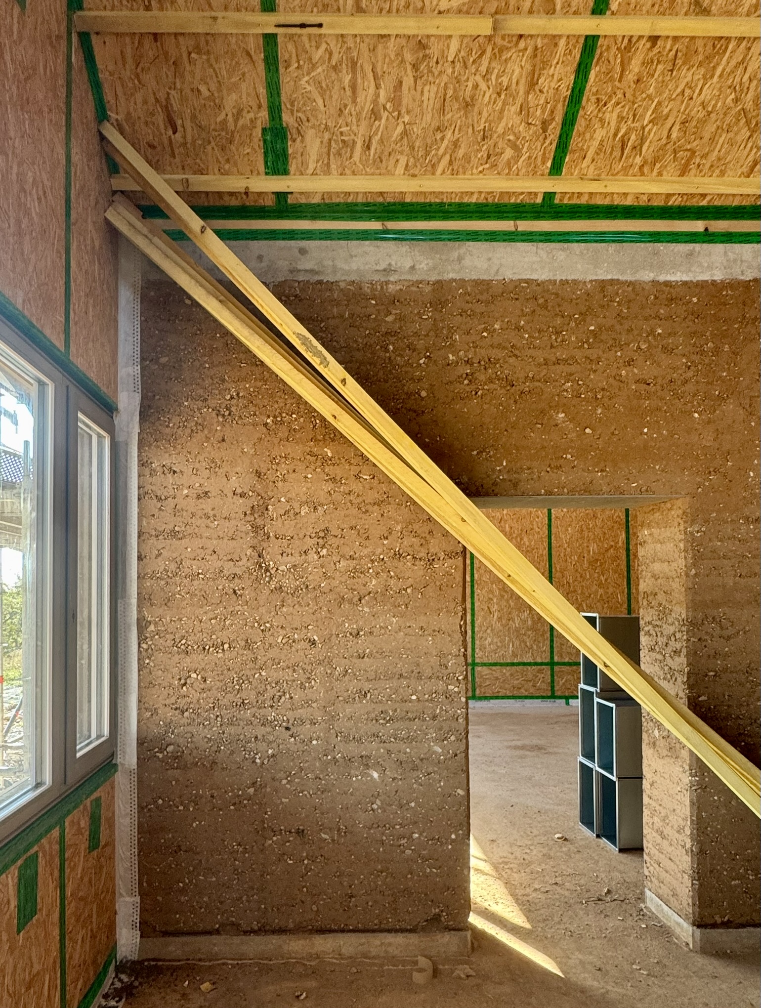 Nouveau groupe scolaire avec des murs extérieurs en pisé. Image du chantier en cours, rejointoiement et finition par l'entreprise Joseph Gargano.